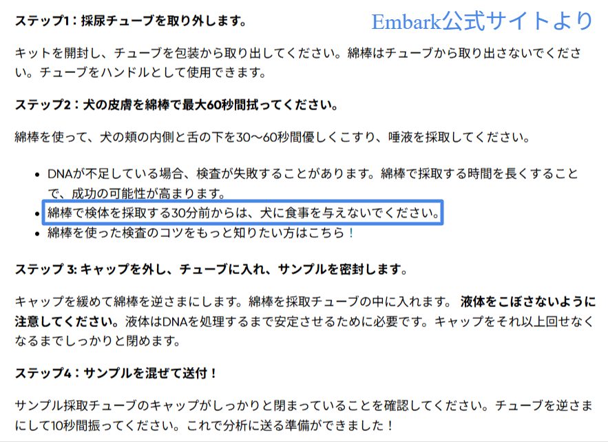 再採取になると、結果受取が数ヶ月単位で遅れます。費用が免除される場合でも、時間のロスは避けられません。Embarkの公式ガイドラインにも「採取30分前は飲食禁止」と明記されています。