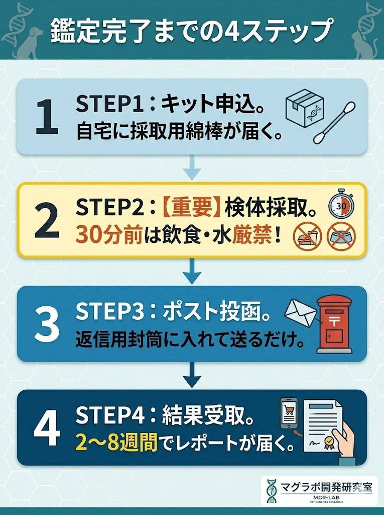 採取から結果受取まで全4ステップです。最大の落とし穴は採取前の飲食。ここを誤ると再採取になります。
