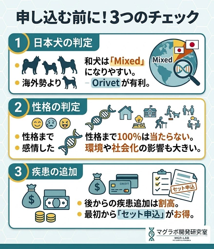 「最初から疾患も気になる」という方は、Orivet GenoPet+(税込¥29,600)またはEmbark Breed + Healthを最初から選ぶ方がコストを抑えられます。後から追加するより、まとめて申し込む方が合理的です。