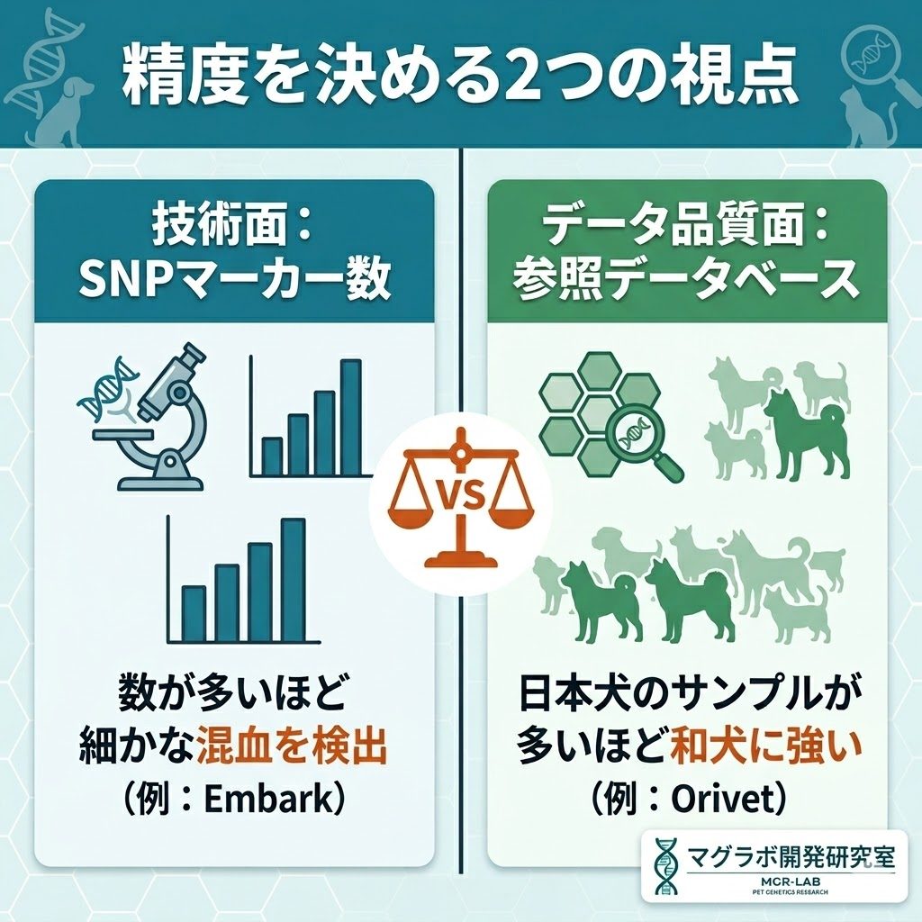 犬種鑑定の精度を決めるのはSNPマーカー数とデータベース品質の2つです。料金が安くても精度が高いサービスは存在します。