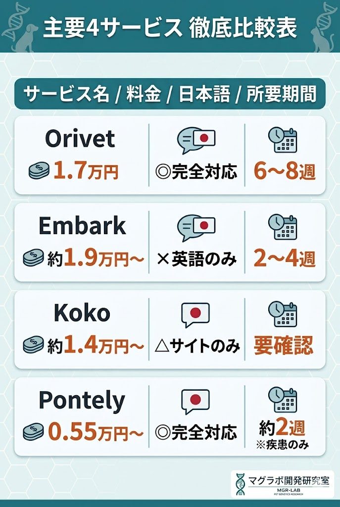 4サービスの料金・SNPマーカー数・日本語対応・所要日数・データ保管場所を一覧化します。サービス選択の最終確認に使ってください。