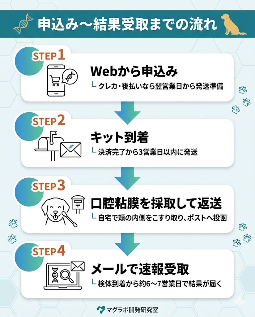 全体の流れを把握しておくと、スケジュールの見通しが立てやすくなります。キット発送→採取→返送→速報受取というシンプルな4ステップです。