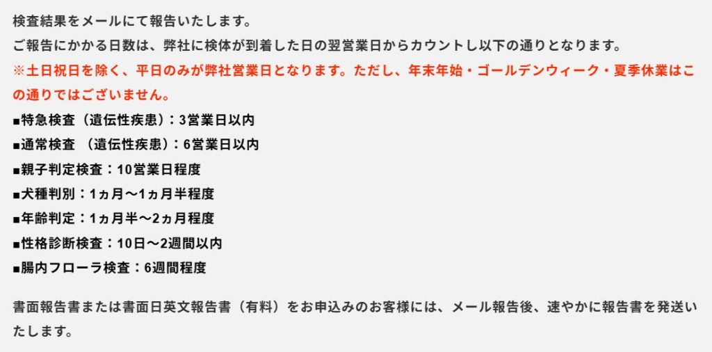 検査結果はメールによる簡易速報で受け取れます(無料)。書面での郵送報告書を希望する場合は別途費用が発生します。