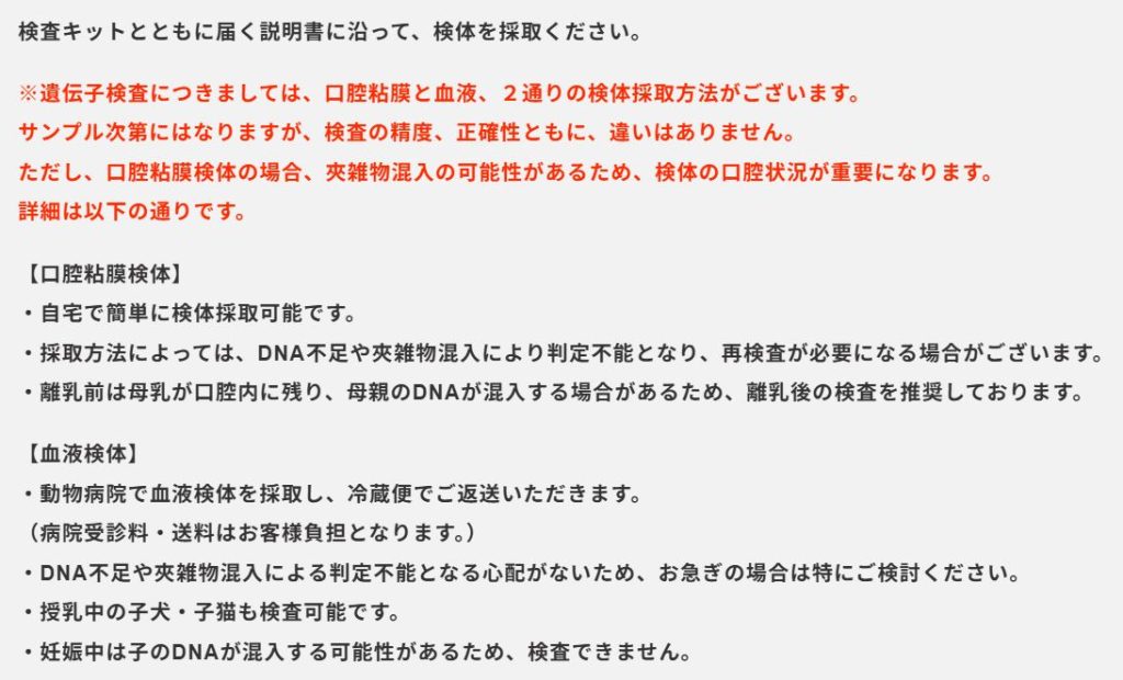 口腔粘膜がうまく採取できない場合や授乳中の子犬の場合は、動物病院経由の血液検体に切り替えられます。