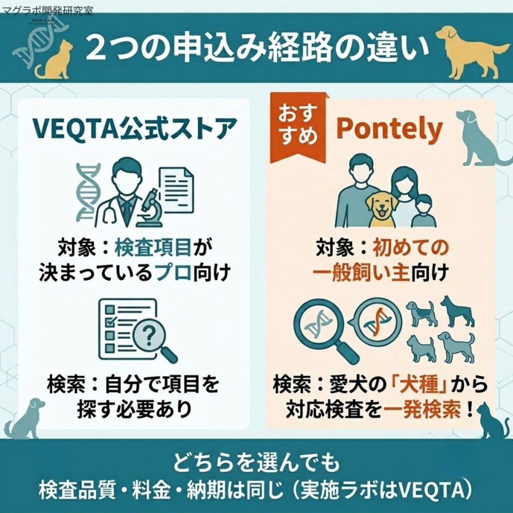 申込み経路はVEQTA公式ストアとPontelyの2択で、犬種検索のしやすさで選ぶなら、Pontelyが一般飼い主に向いています。